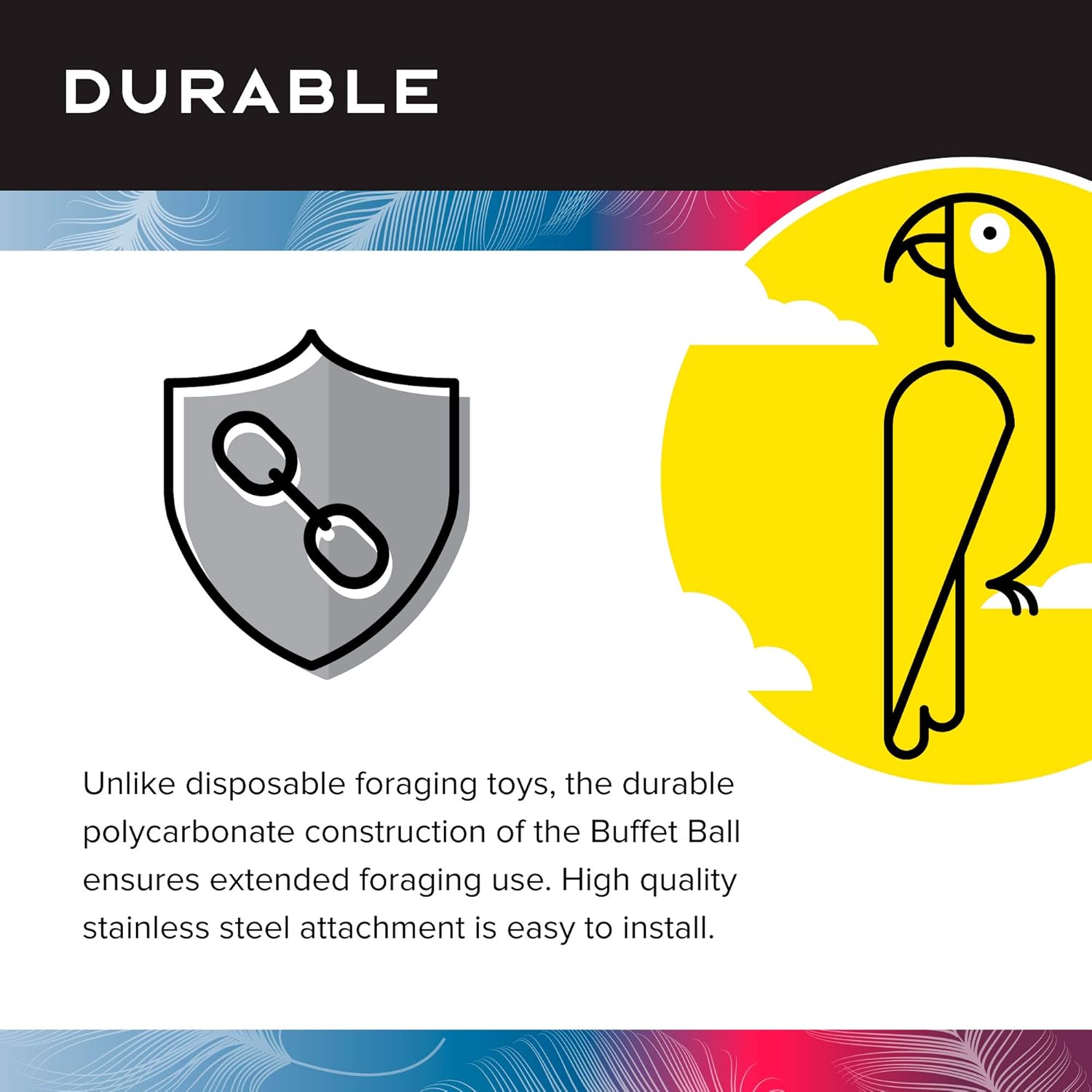- DURABLE: Unlike disposable foraging bird toys, the durable polycarbonate construction of the Buffet Ball ensures extended foraging use; High quality stainless steel attachment is easy to install