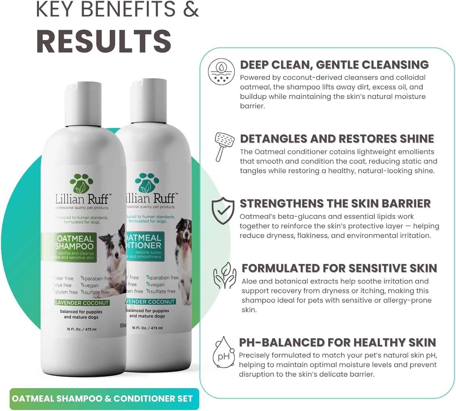 - Complete Coat Care: Elevate your pet's grooming routine with the Lillian Ruff Shampoo and Conditioner Set. Crafted with natural oatmeal and aloe, the shampoo provides deep cleansing and replenishment of the skin's natural moisture, while the conditioner offers intense hydration, leaving your pet's coat soft, shiny, and revitalized.