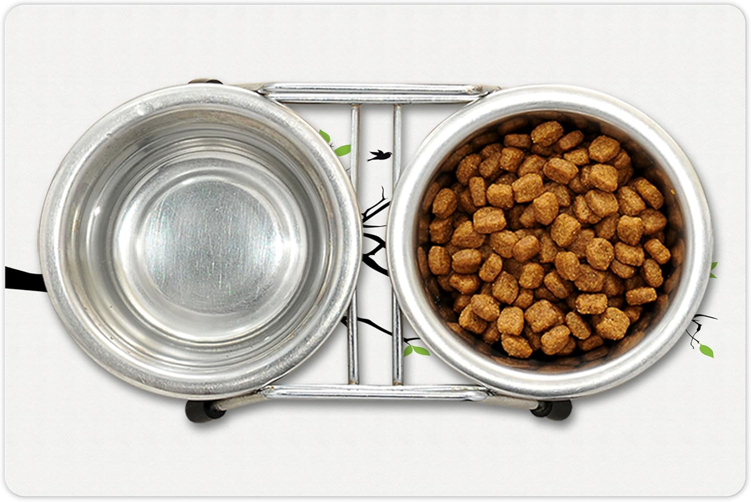 Lunarable Cat Lover Pet Mat for Food and Water, Animals in Love on Tree Branch Flying Birds Nature Romance Illustration, Non-Slip Rubber Mat for Dogs and Cats, 18" X 12", Lime Green