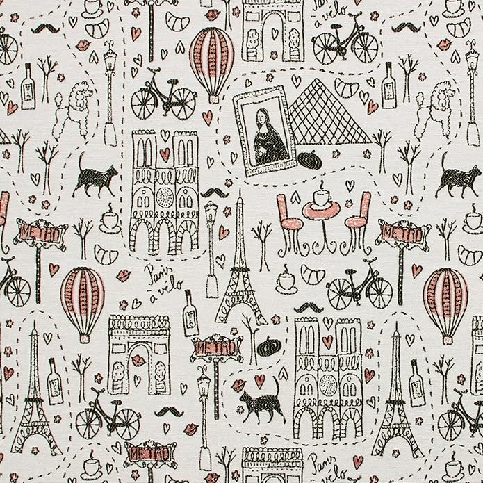 - L'Amour fabric is Paris themed with pink accents on a white background; Parisian landmarks like the Eiffel Tower, Louvre, Notre Dame and Arc de Triomphe are hand drawn and are delightfully lighthearted and whimsical