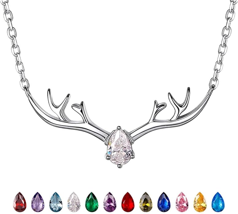 SILVERCUTE Sterling Silver Birthstone Necklaces for Women, Xmas Antler Deer Pendant Necklace with Colorful Cubic Zirconia,16-18 inches