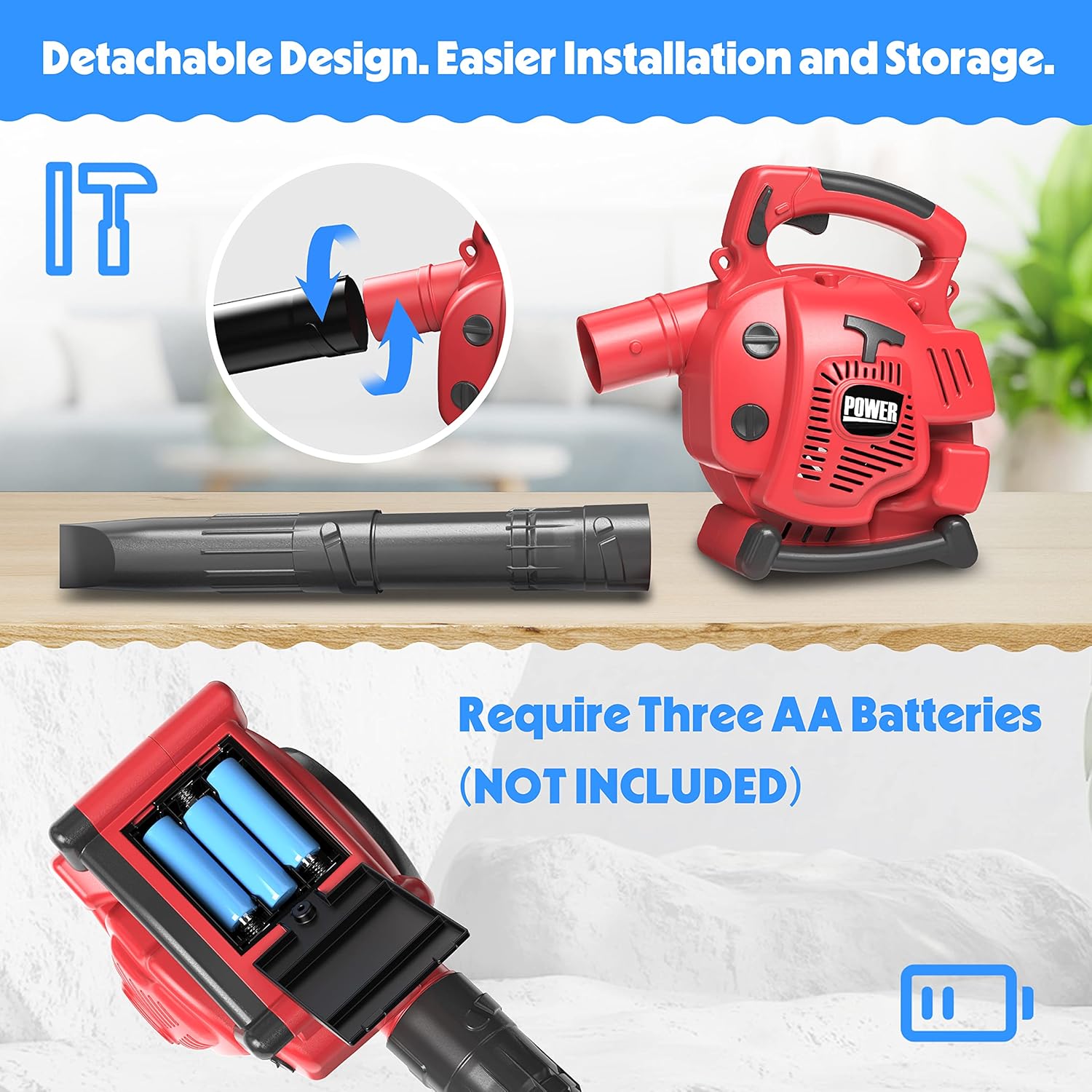 - Toy Leaf Blower for Toddlers 1-3 : The toddler leaf blower is made of safe plastic ABS, , which has good stability and is not easy to damage. Requires 3 AA batteries (not included). Smooth surface allows you not to worry about children being scratched by veining