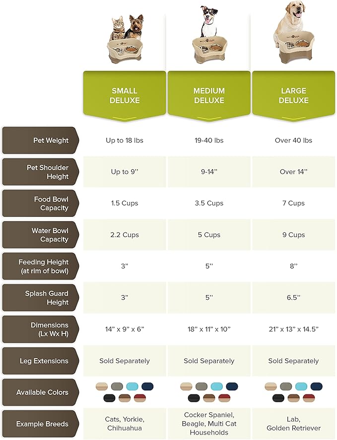 - ELEVATED DOG BOWLS FOR LARGE DOGS: Designed for large-sized dogs like Labradors and Golden Retrievers, the Neater Feeder Large Dog measures 21” L x 13” W x 14.5” H (with an 8” feeding height). The set includes a 3-cup slow feed bowl for food & a 9-cup extra-capacity water bowl.