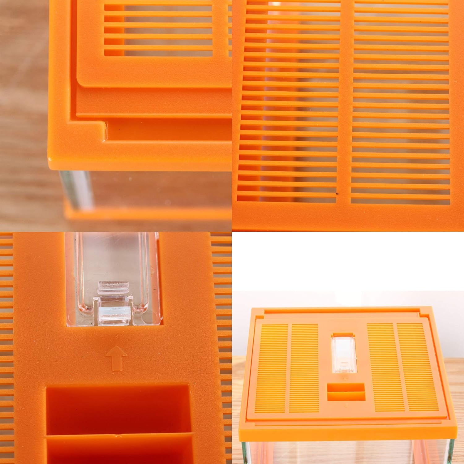 - 1. Glass body & pale orange cover.Top window ventilation,safe lock prevent escape, a feeding hole.