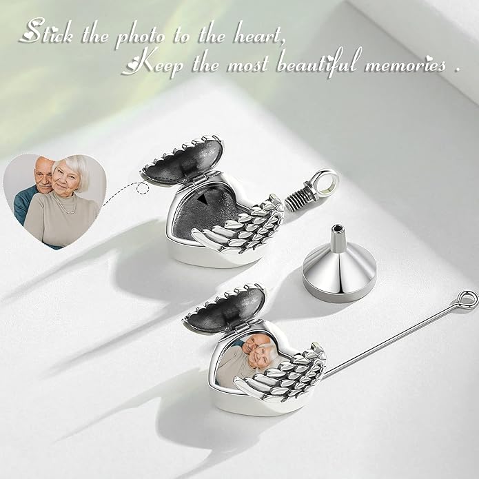 - ❤[Angel Wing Picture Locket Necklace]❤ The detailed sterling silver urn keepsake is a wonderful tribute to your loved one. This high quality urn pendant will hold a small amount of cremains in remembrance of your loved one. A threaded stopper assures you that your loved ones cremains are protected inside your keepsake urn pendant.
