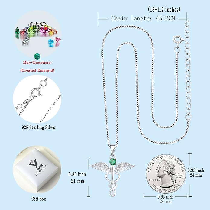 YL Caduceus Necklace Sterling Silver Doctor Nurse Themed Pendant Birthstone Angel Wings Snake Jewelry for Women