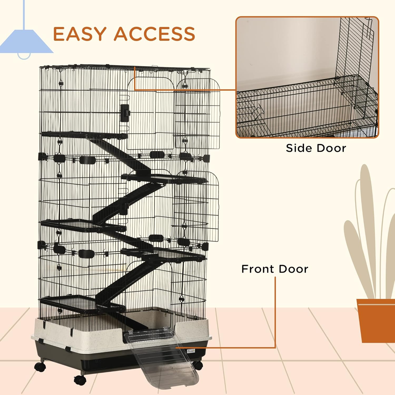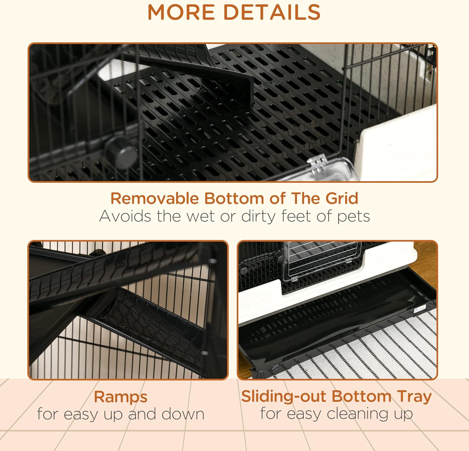 - Convenient In & Out: The multiple doors of this small pet cage allow for easy access to the inside. The indoor bunny cage also features a deep base containing litter and has removable sliding-out bottom trays for easy cleaning up.