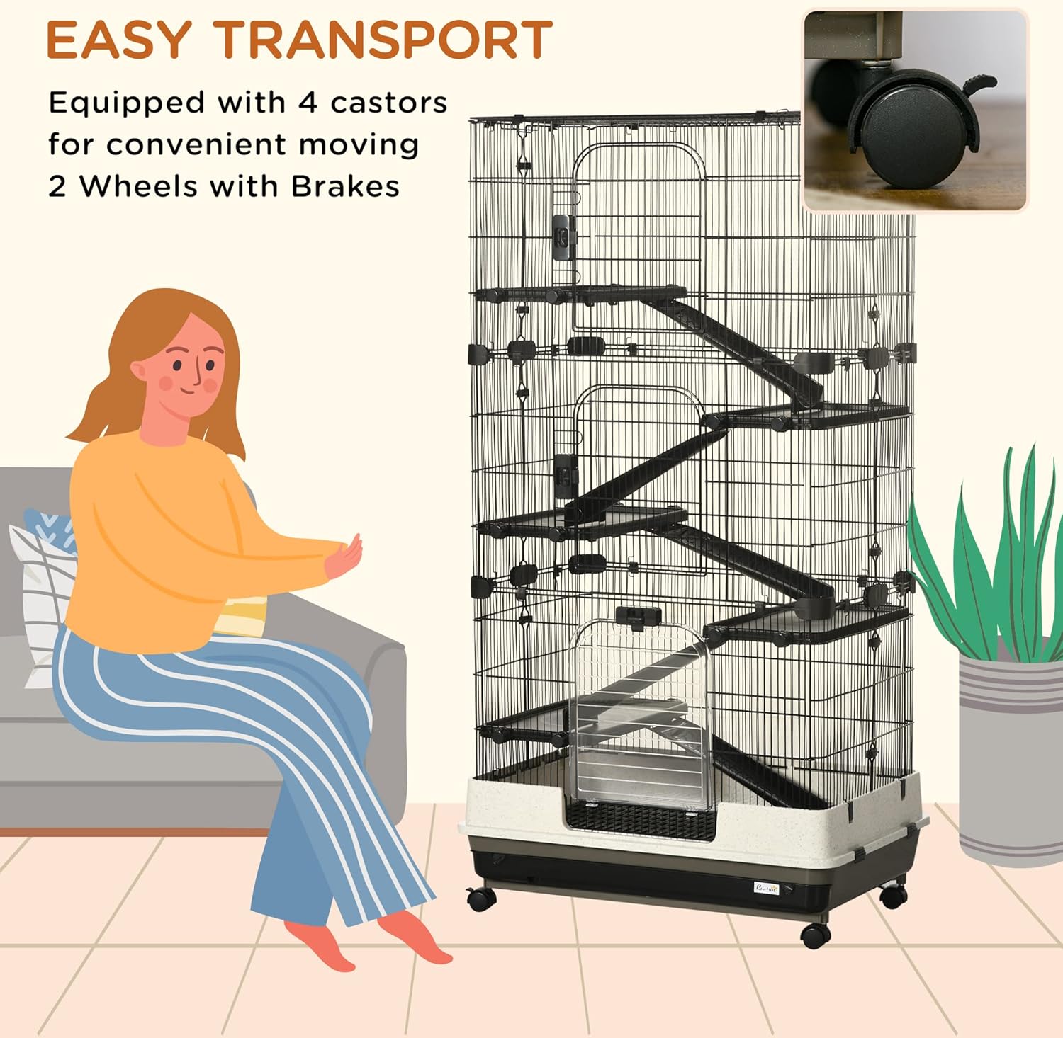 PawHut 59.5" Small Animal Cage with Wheels, 6-Level Portable Bunny Cage, Chinchilla Ferret Cage with Removable Tray, Platform and Ramp