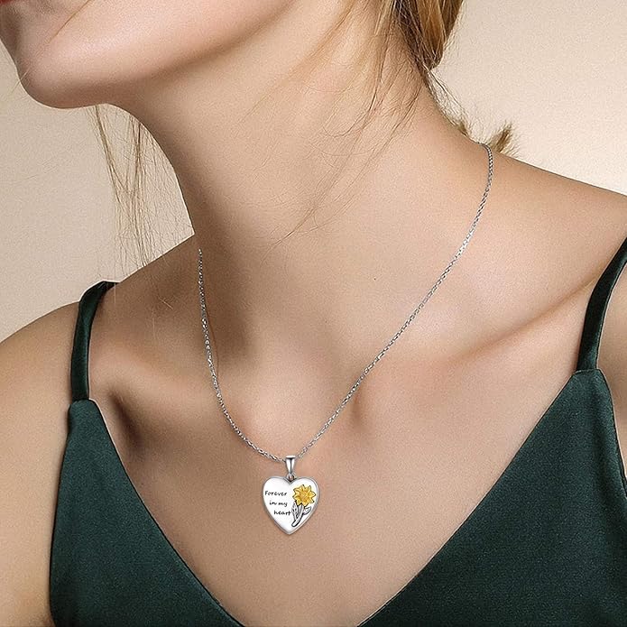 - Cremation Jewelry: This sunflower design urn necklace for ashes means no matter where they are they would be like a sunflower brings comfort and warm in life, engraved “Forever in my heart”
