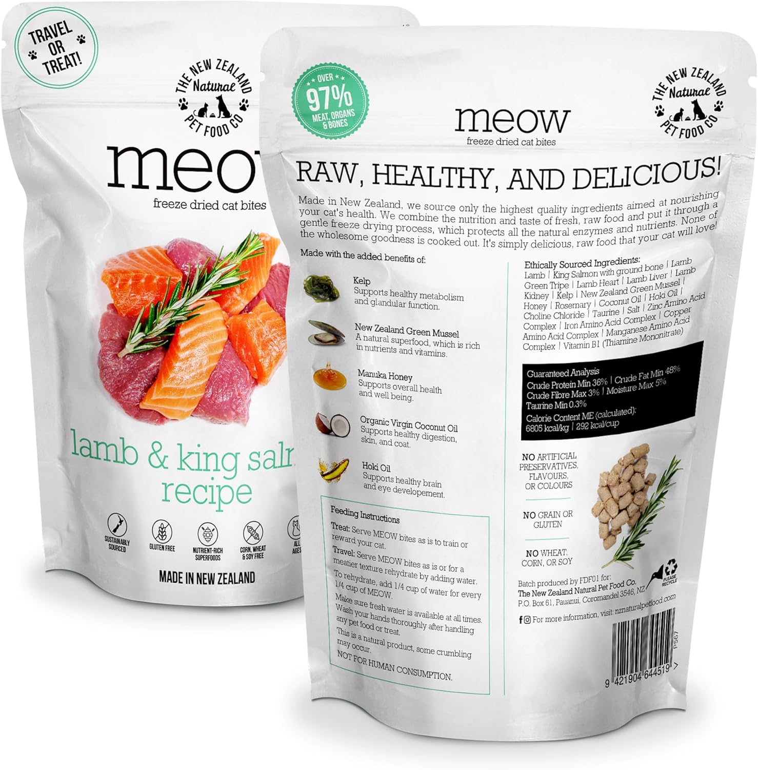 Meow Lamb & King Salmon Freeze Dried Raw Cat Food, Mixer, or Topper, or Treat - High Protein, Natural, Limited Ingredient Recipe 1.76 oz