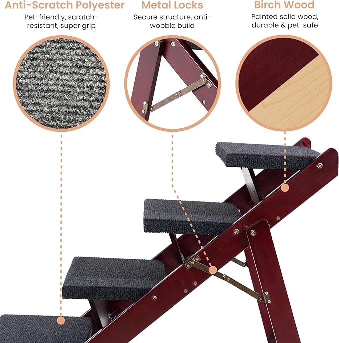 - 1. Adjustable 3-in-1 Ramp & Stairs Easily switch between stair and ramp mode to suit your pet’s needs. Whether for aging joints or tiny paws, our 3-in-1 foldable design (Stair / Ramp / Storage) ensures safe and comfy climbs.
