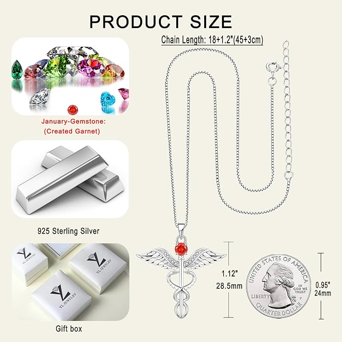 YL Caduceus Necklace Sterling Silver Doctor Nurse Themed Pendant Birthstone Angel Wings Snake Jewelry for Women