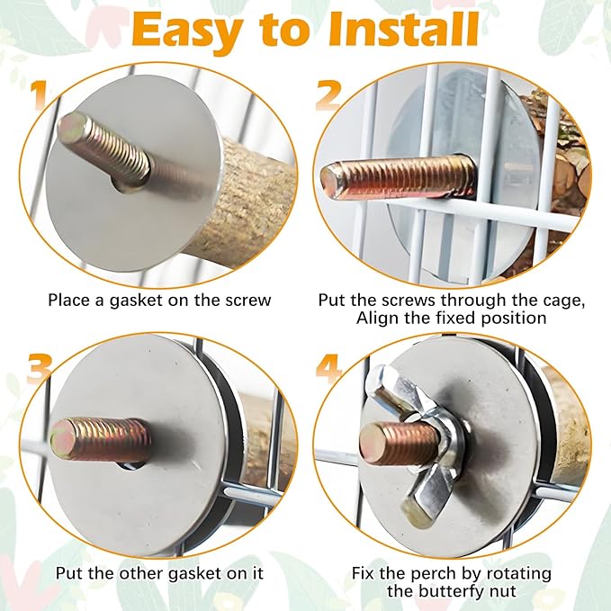 - [PACKAGE] Each package contains 8 perches, including four natural standing tree branches,four natural prickly ash perches,4 high quality 304 stainless steel washers and 4 wing nuts for easy mounting onto the cage