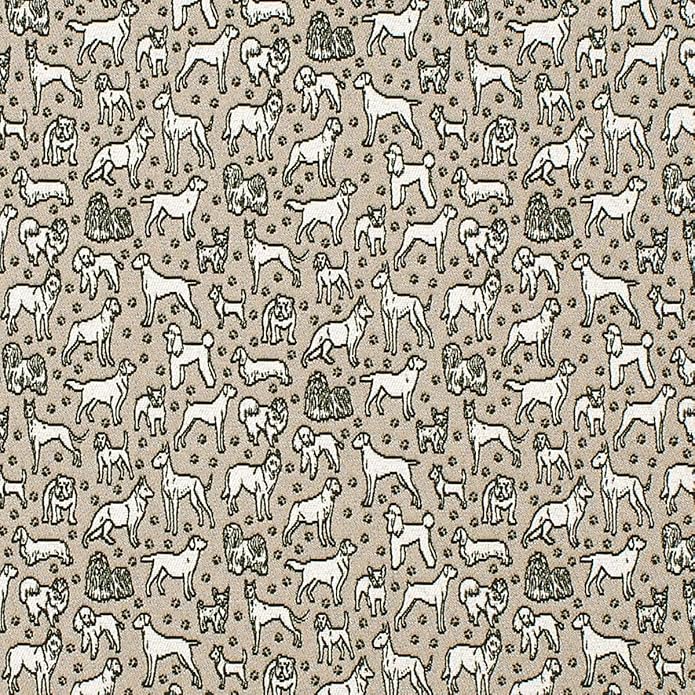 - Dogs fabric features dozens of dog breeds on a khaki-color background with paw prints; perfect for walking the dog!