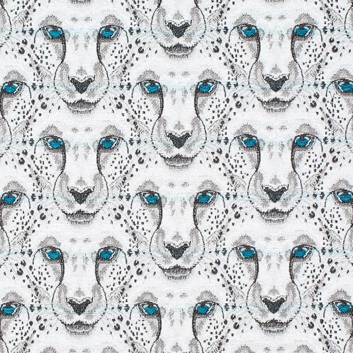 - Snow Leopard fabric with velvety soft white chenille face and dazzling inset turquoise chenille eyes