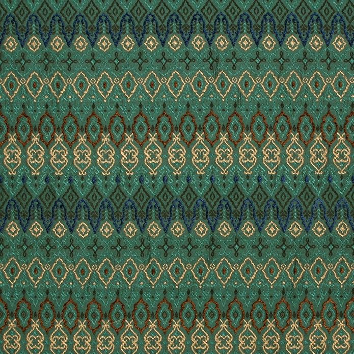 - Monrovia fabric evokes sultry Moroccan design with a turquoise background and repeating patterns of blue, turquoise and gold with brown and blue velvety inset chenille dots