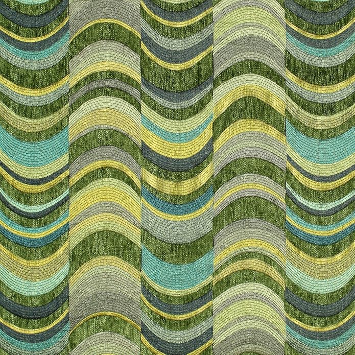 - Malibu/Green fabric in contemporary waves of blue, green and yellow with green velvety inset chenille.