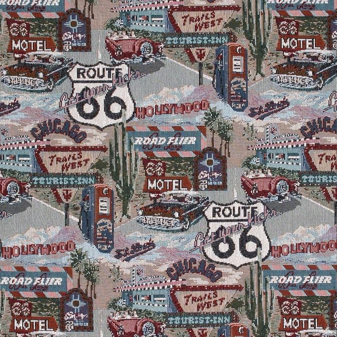 - Route 66 fabric features the iconic Route 66 emblem with scenes and cars from the era