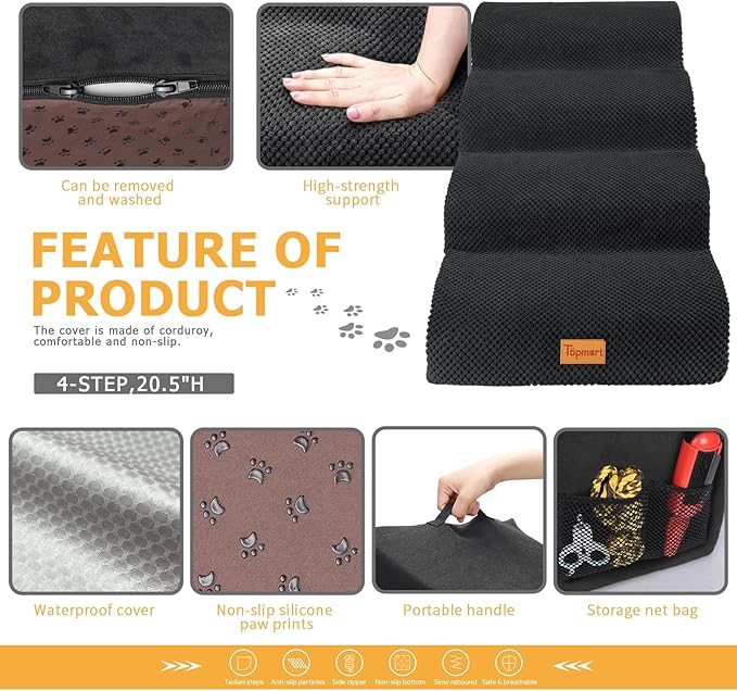 - Safer,Wider&Deeper Steps:Each step is 15.75in x 7.1in.Our dog stairs are excellent for those older dogs who are less mobile as they age or for cats with injuries. More wide and deep steps are helpful for reducing the strain that constantly jumping up and down onto bed,sofa or car can have on your pet's joints,and topmart dog steps will not shake and slip during use. The cover made of corduroy is more frictional than other covers, pets will not slip on the stairs.