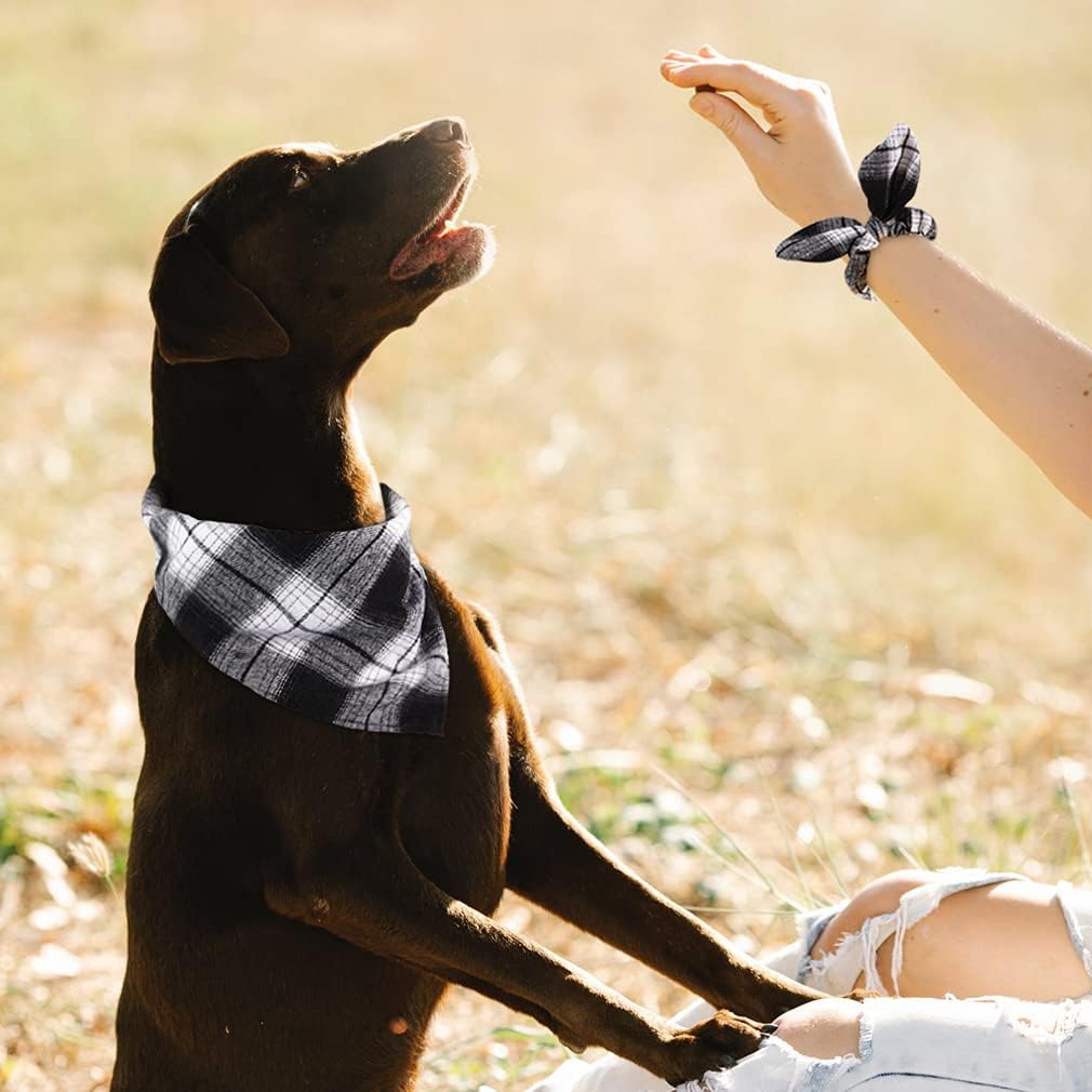 - Matching Bandana and Scrunchie Set - It’s full of love when your pets is wearing the buffalo bandanas and you are wearing the bow scrunchies. When traveling, sleeping, taking photos or daily walking, adorable doggie bandana and plaid scrunchie is a pretty accessories. The scrunchie can be worn as a wrist accessory and hold your hair. Beautiful dog drool bibs and bow scrunchie with black and white check pattern, it’s nice photo props.