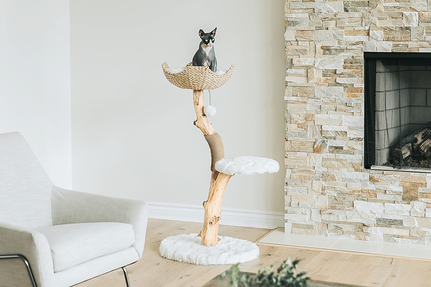 - BEAUTIFUL & UNIQUE DESIGN: Unlike most cat furniture, this wood and wicker cat tree tower will enhance the look of your home and provide a comfy place for kitties up to 15 Pounds to lounge in. It includes a beautifully crafted, one-of-a-kind trunk that holds both a hand-woven wicker basket (with machine washable cushion included) and a cushioned platform step. It's perfect for your kitty to nap happily while you can enjoy looking at a beautiful piece of art that adds to your home's aesthetics.