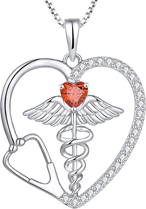 YL Caduceus Heart Necklace for Women Sterling Silver Doctor Nurse Themed Stethoscope Pendant Birthstone Angel Wings Snake Jewelry