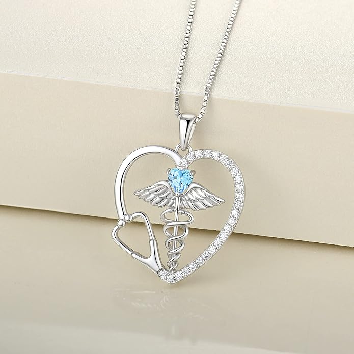 YL Caduceus Heart Necklace for Women Sterling Silver Doctor Nurse Themed Stethoscope Pendant Birthstone Angel Wings Snake Jewelry