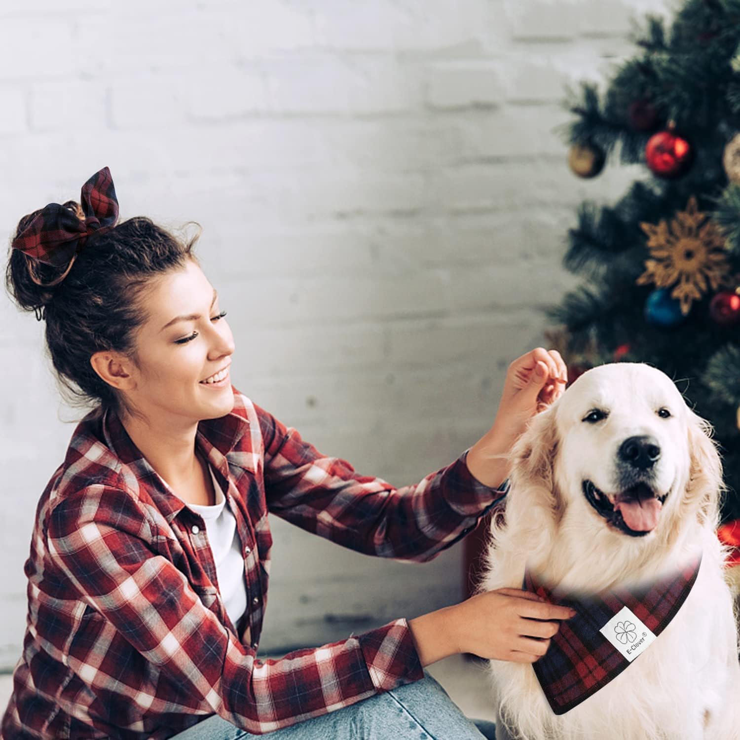 E-Clover Dog Bandanas & Matching Scrunchie Set Plaid Dog Scarf Bibs for Medium Large Dogs Girl Boy Pet Owner Gift Red Blue