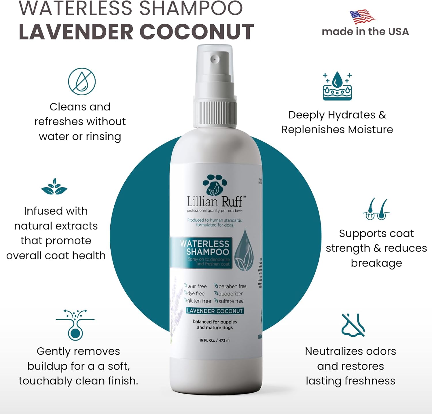 Lillian Ruff Waterless No-Rinse Dog Dry Shampoo Spray with Hydrating Essential Oils - pH-Balanced Dry Shampoo for Dogs - Clean, Condition, Detangle & Deodorize Dry, Sensitive Skin (Lavender Coconut)