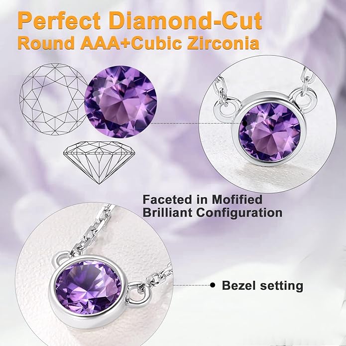 - February Birthstone Necklace -Amethyst, Stunning 6mm cubic zirconia crystal round set in a silver pendant to complete this small pendant.