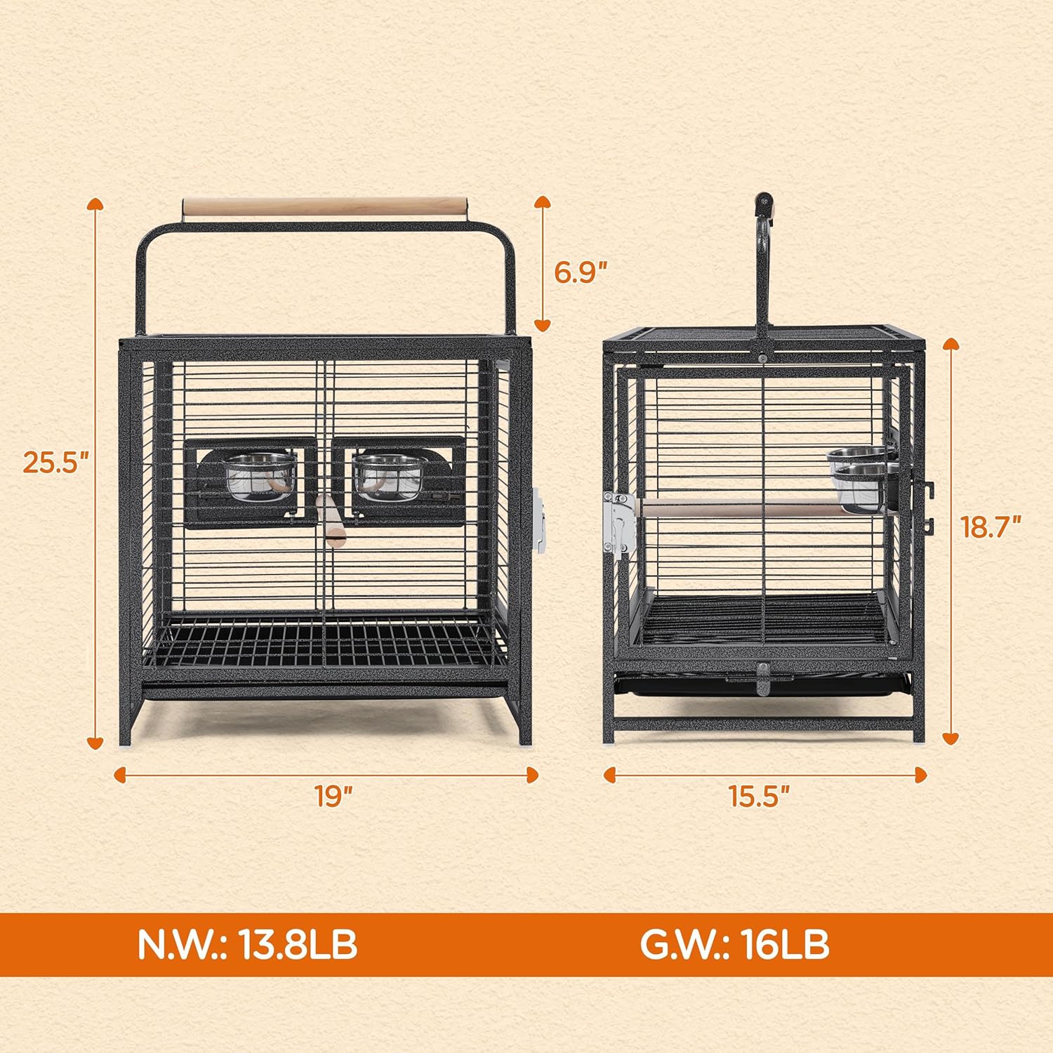 - Substantial Materials: Constructed from powder-coated wrought iron in a hammered finish, this bird travel cage boasts high strength, water resistance and all-around durability. The stainless-steel feeders provide a reliable feeding station for your birds