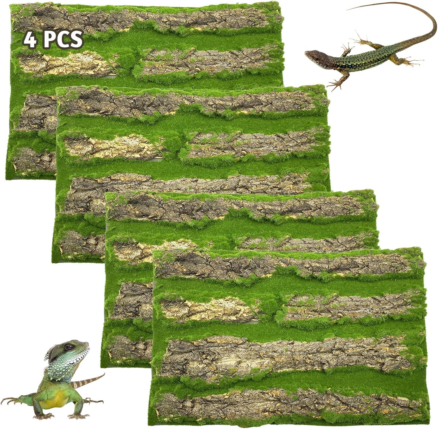 PINVNBY Reptile Terrarium Cork Background, Bearded Dragon Tank Bark Backdrop Wall Decor with Artificial Moss for Gecko Lizard Tortoise Frog Chameleon(4 Pack)