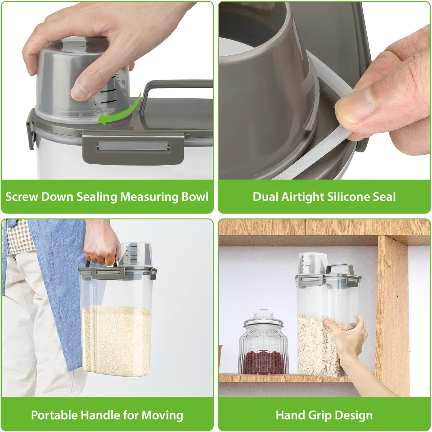 Rice Airtight Storage Container, 3 to 5Lbs Cereal Dry Food Flour Bin, Pet Dog Cat Food Dispenser with Measuring Cup, BPA Free Clear Plastic Kitchen and Pantry Organization Bin for Sugar