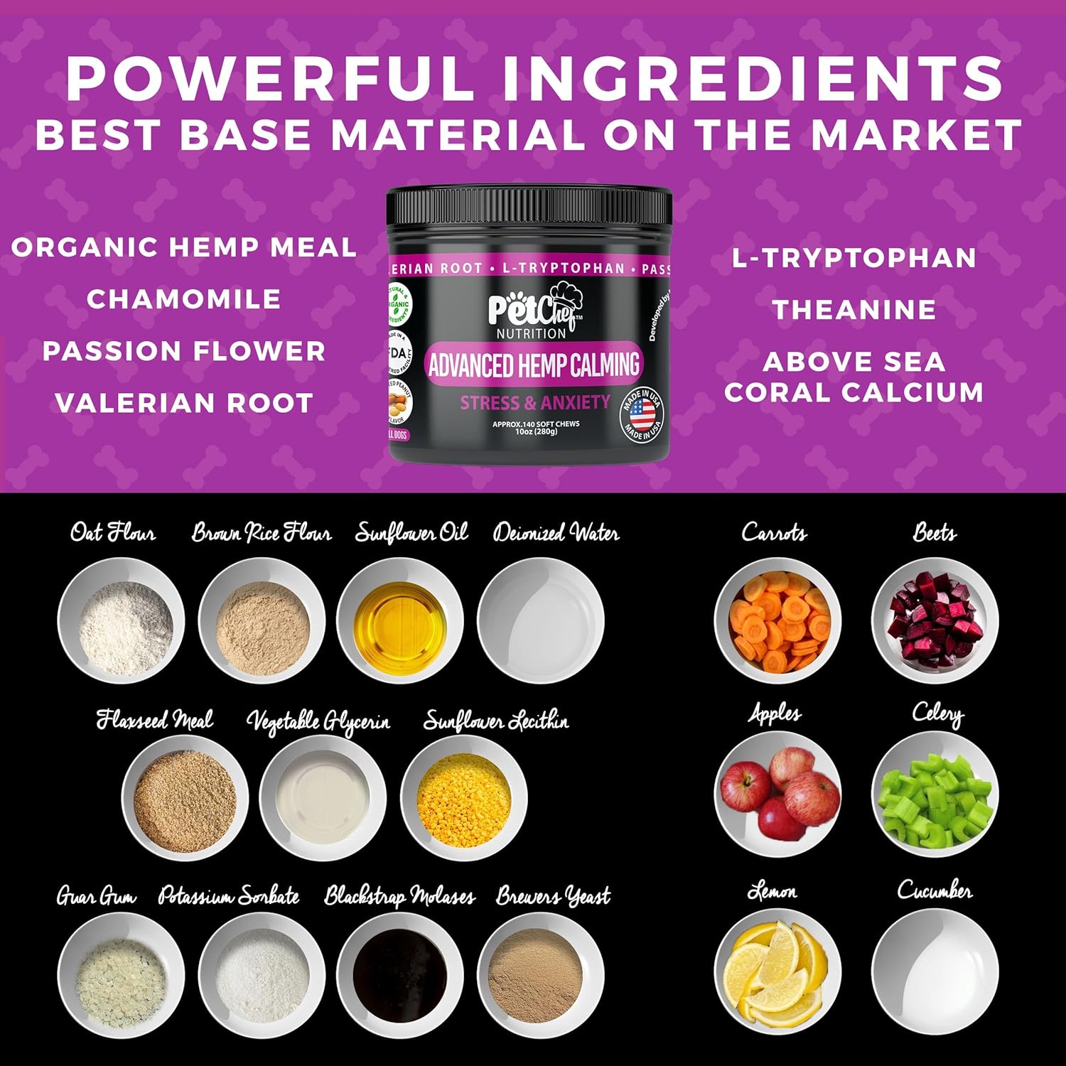 - Overcome Separation Anxiety - Soothe your dog's nerves during loud noises and separation anxiety. Our vet-recommended puppy calming chews are non-addictive, promoting a sense of calmness and reducing pacing or crying. Natural Calming Aid: dog calming chews - anxiety relief treats support help relieve your pet of any stress or anxiety using natural ingredients like passionflower, chamomile, hemp powder, hemp oil