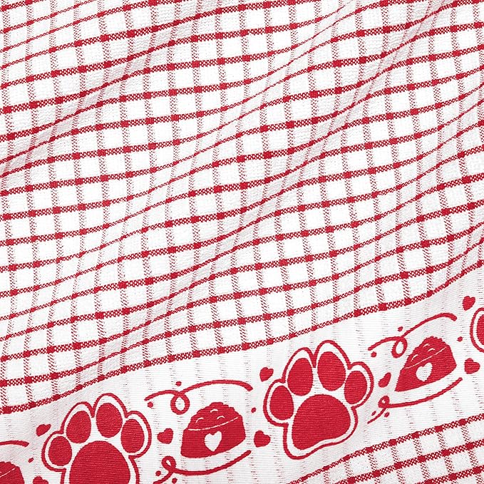 - Set of four red and white windowpane check terrycloth towels with adorable paw prints, food bowls, and hearts on the border