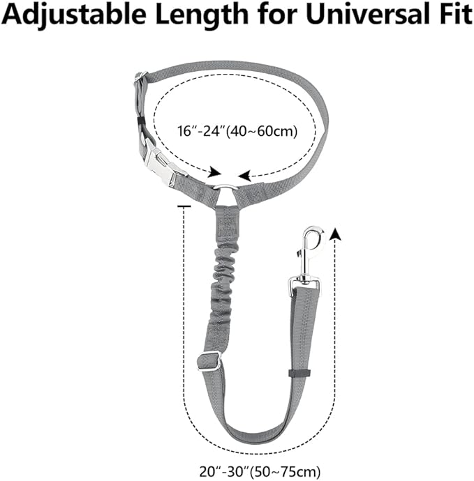 - Adjustable Length. With a metal adjustable buckle and built-in bungee, the leash can be adjusted from 20” to 30”, and can be stretched to 34” for the maximum length, providing enough space for your dog to sit, stand, lie down, and reach for the window.