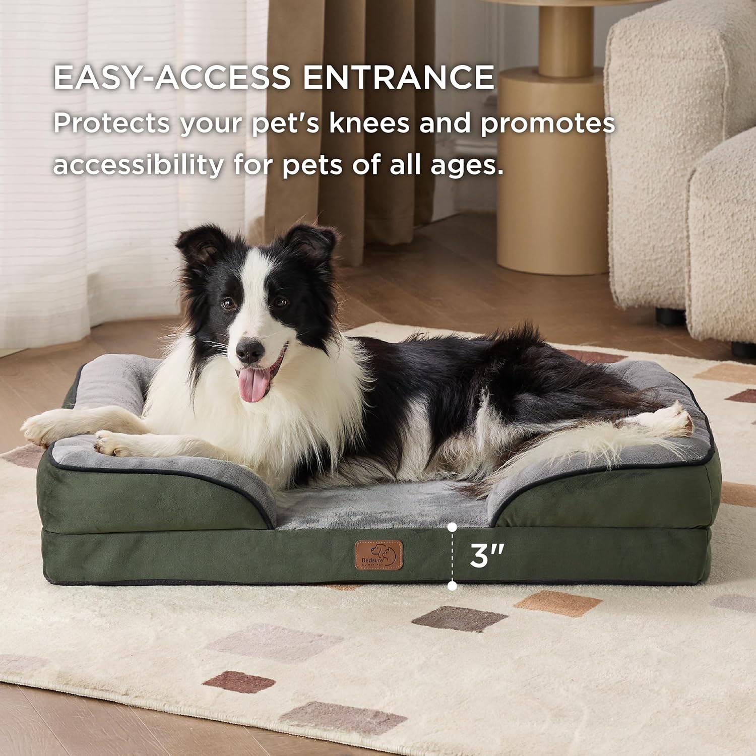 - Enhanced Comfort: The 4-sided bolster design promotes ultimate comfort and security, offering your pet a variety of cozy positions to snuggle. The cushioned bolster shape is deeply filled to support your pet’s head and neck for a more restful sleep. And the lowered entrance protects your pet's knees and promotes accessibility.