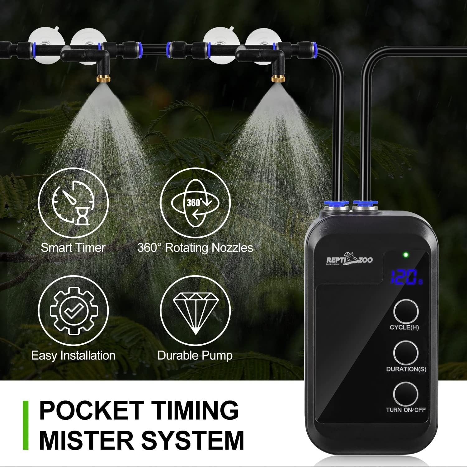 - 【Intelligent Circulation Reptile Misting System】With smart timing function, regular cycle spray can be set to humidify the terrarium. No worry about your reptiles when you are going out for days.And the operation is simple.