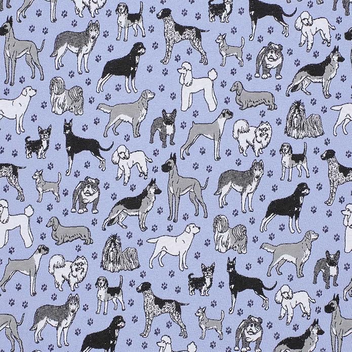 - Barker 1 fabric shows a variety of favorite dog breeds against a sky-blue background with paw prints. Perfect for walking the dog!