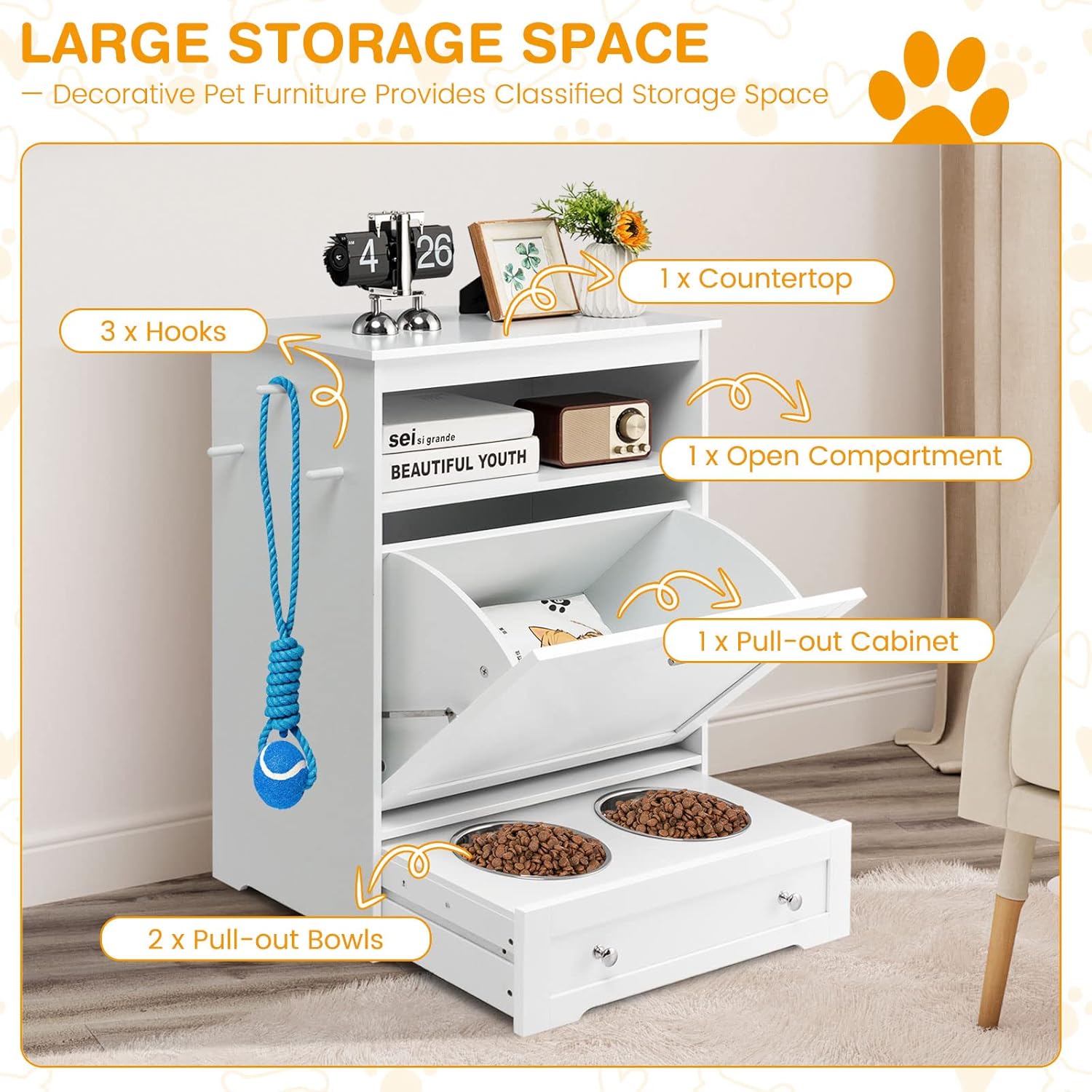 Tangkula Pet Feeder Station, Dog Food Storage Container with Double Pull Out Dog Bowls, Pet Food Toy Organizer Cabinet, Pet Feeding Station Furniture for Dogs Cats Feeding & Watering Supplies (White)