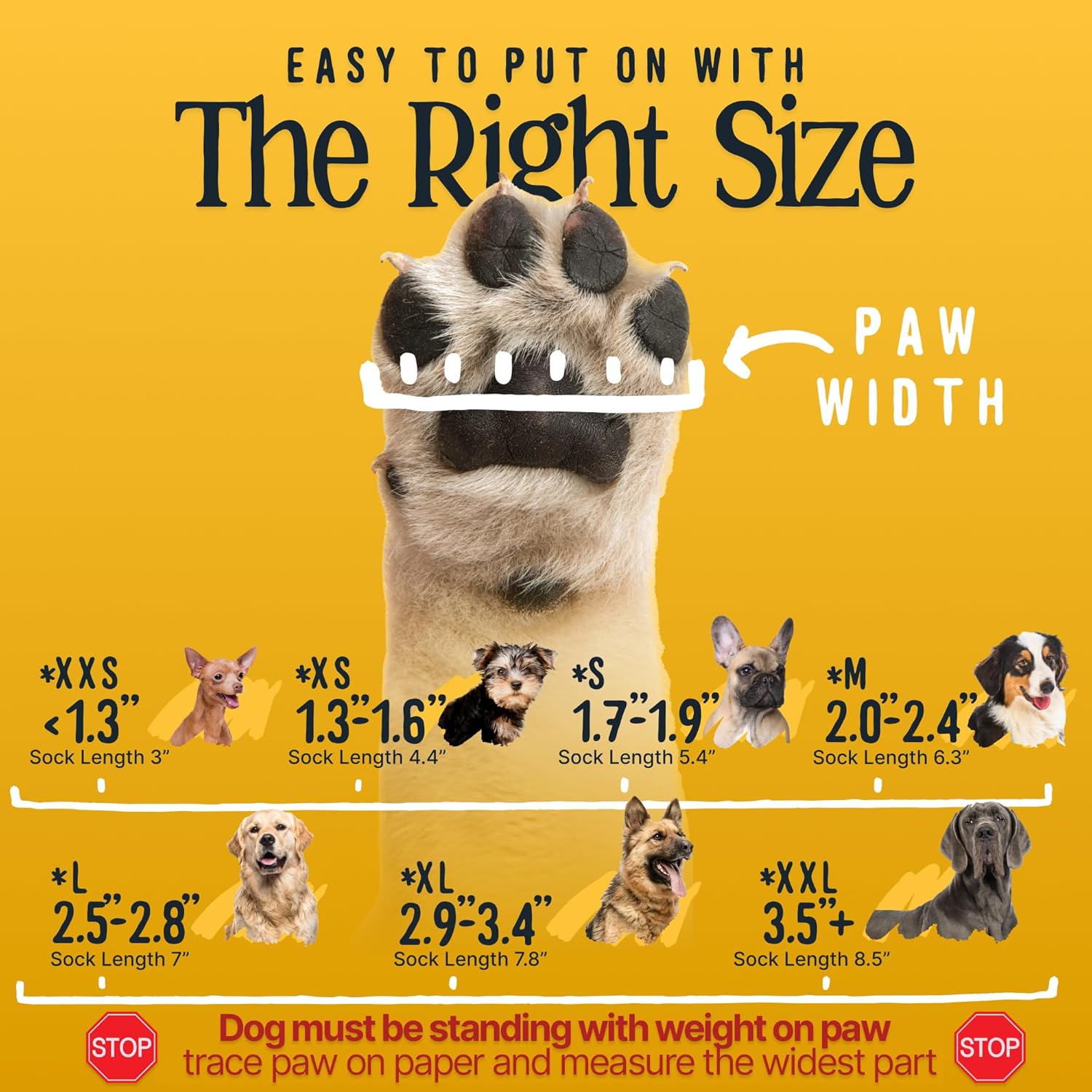 - Large fits paws 2.5" - 2.8". Measure while dog is standing with weight on paw. Includes 4 dog grip socks. Snug fit is normal—extra grip makes them stiffer than other socks but provides better traction