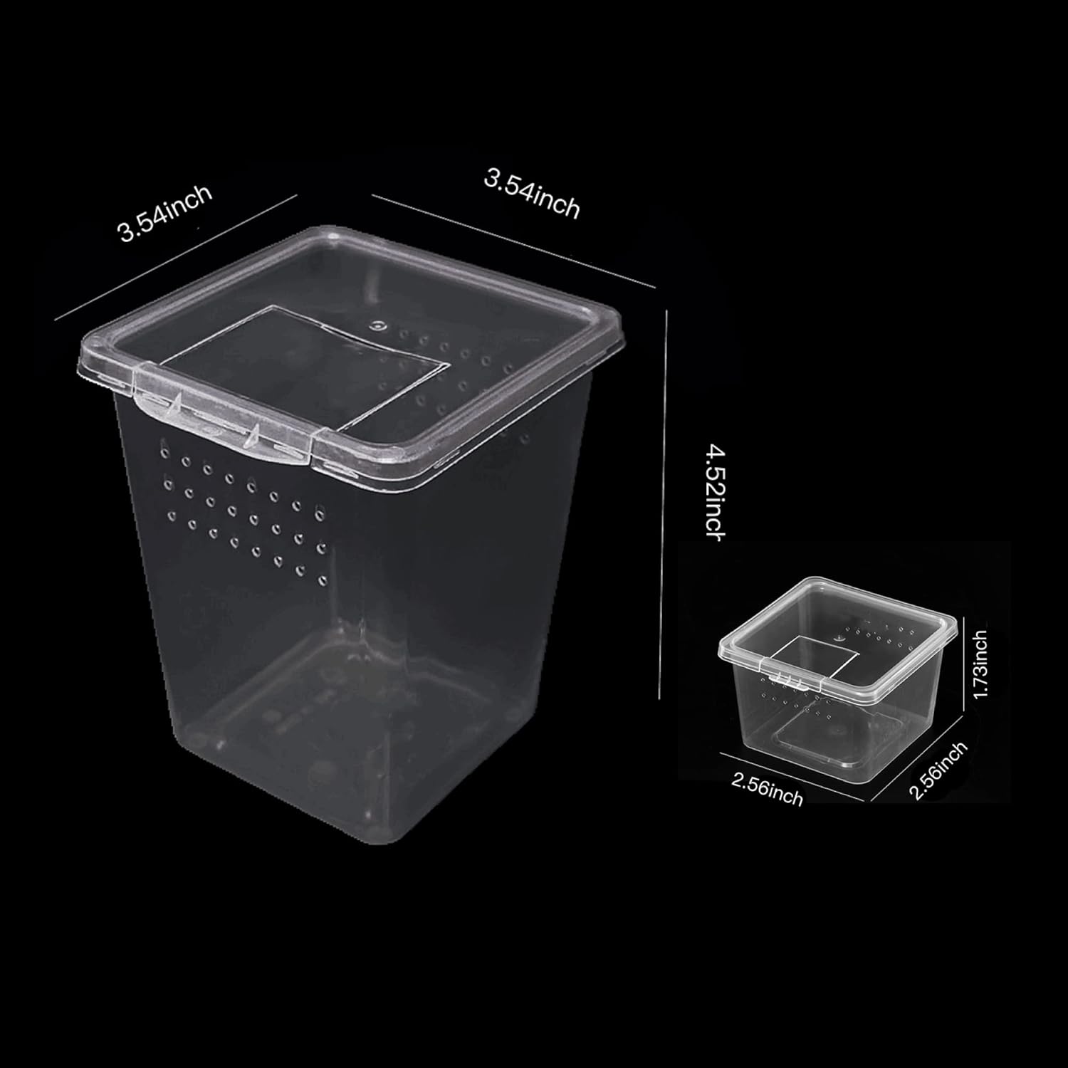- 【insect Box Set】: package include 4 pcs high insect terrarium and 4 pcs small breeding box ,high box measure about 3.54"L x 3.54"W x 4.52"H, small box measure about 2.56"L x 2.56"W x 1.73"H,Made of quality plastic material, good transparency, sturdy , reusable, easy to clean, easy to clean, lightweight and light, suitable for pet incubation, small pet breeding box, temporary feeding or outdoor transportation and carry.