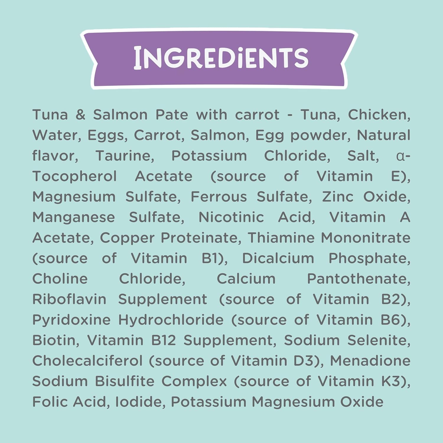 - GRAIN FREE & NON-GMO: Our pate tuna, carrot, & salmon is prepared without any grains, artificial additives, or by-products, as our goal is to feed cats the way nature intended. We always source wholesome ingredients to promote optimal health and nutrition.