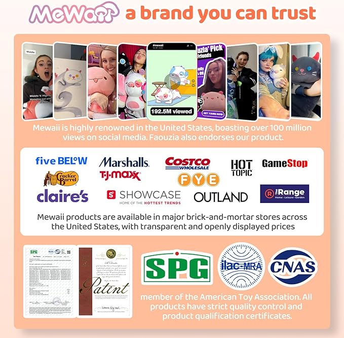 - Mewaii Cat Plush Sizes: 50cm/19.6Inch, 70cm/27.6Inch, 90cm/35.4inch, 110cm/43.3Inch, and 135cm/ 53.2Inch. They are bigger than you imagine, plumper than you expect, and bring you fully envelopment.