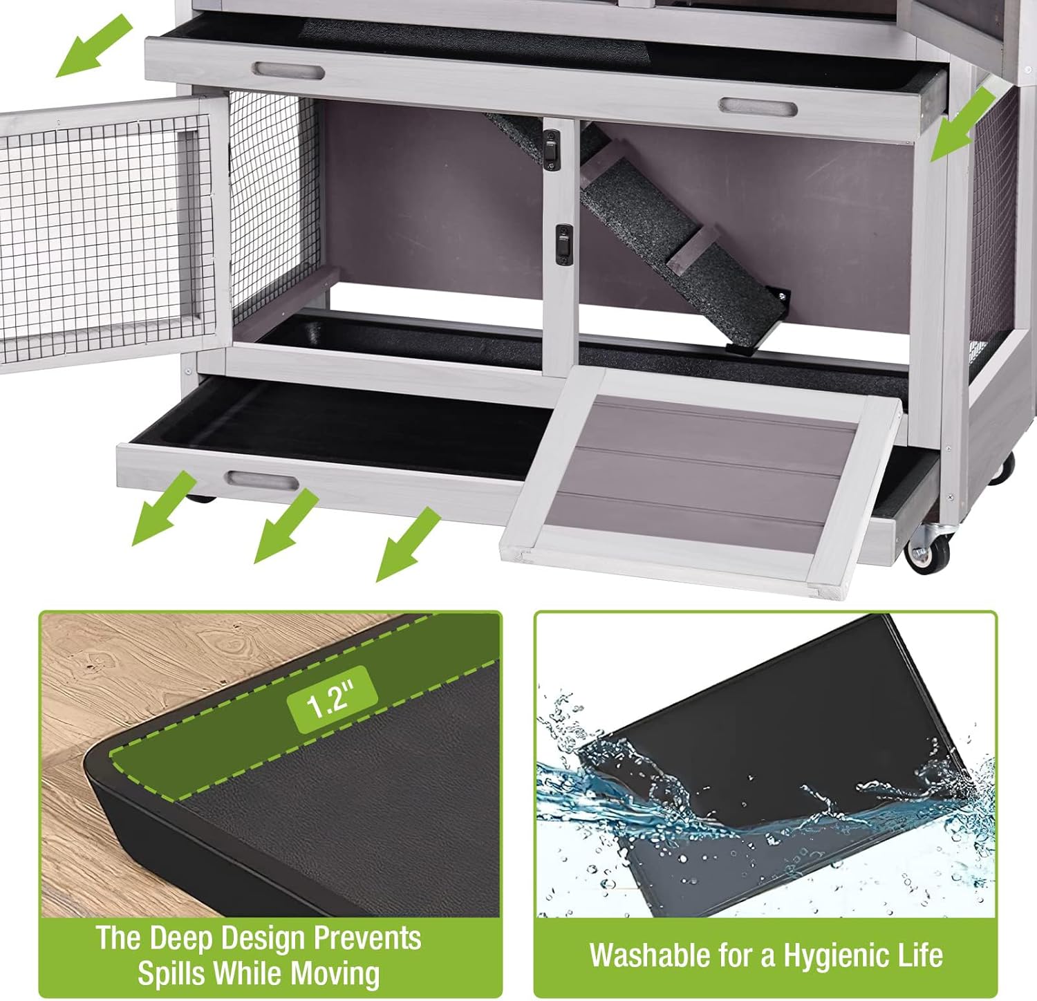 - Rabbit hutch with TWO DEEPER pull out tray that won’t leak off and easy-to-clean