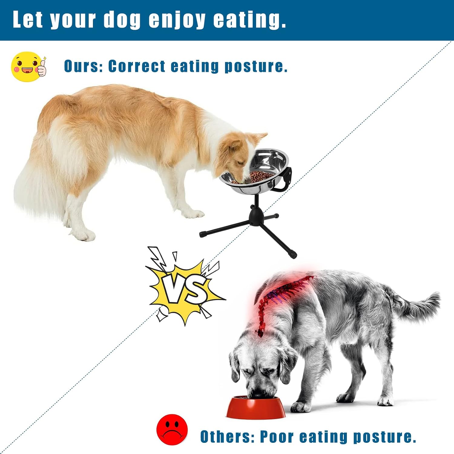 - 【Metal Stand & No-slip Design】This dog bowl set includes a metal stand which is sturdy, durable, and rustproof. The long legs of the tripod stand make the unit more stable. The rubber caps at the ends of the legs prevent the elevated dog bowl stand from moving around on the floor. The plastic tubes on the bowl holder prevent the dog food and water bowl from moving while the dog is eating or drinking. The product is not dog dishes for small dogs, but stainless steel pet bowl for extra large breed.