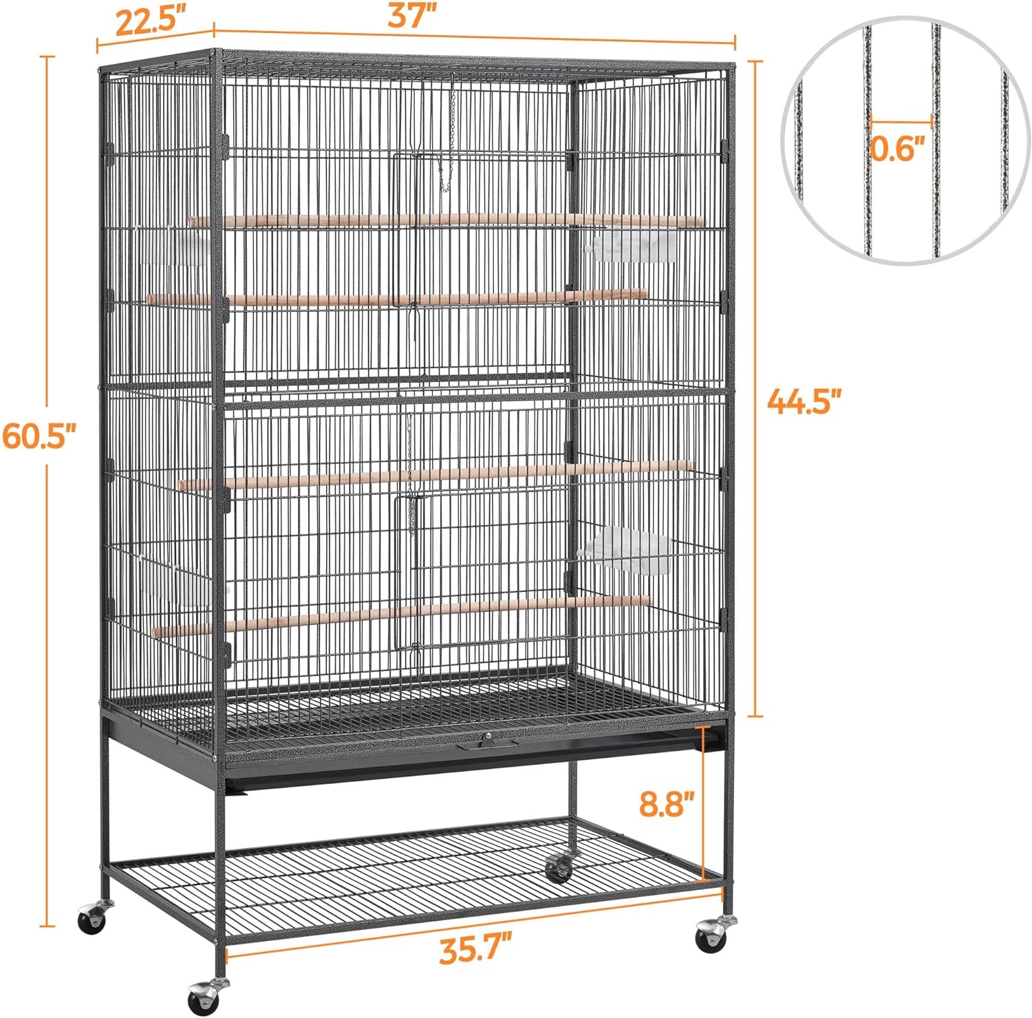 - Spacious Cage For 10-12 Small/Medium Birds: This flight bird cage on wheels measures 37″ L × 22.5″ W × 44.5″ H and features a 5/8″bar spacing, making it an ideal and comfy habitat for 10-12 small/medium-sized birds like budgies, canaries, lovebirds, finches and cockatiels