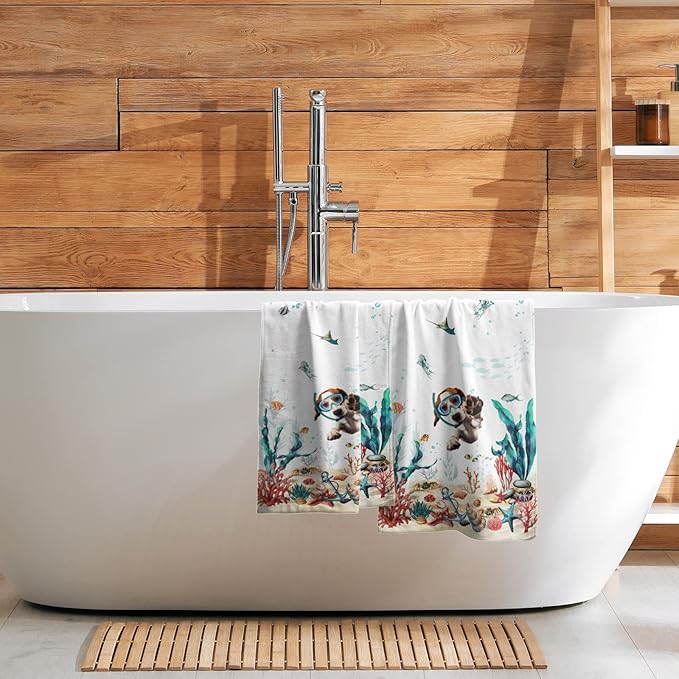 Funny Dog Hand Towels Set of 2 Teal Blue Sea Ocean Small Bath Towels Soft Absorbent Decorative Towels for Kitchen Dish Spa Yoga Guest