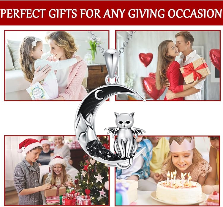 - Cat gift for cat lovers: The special mountain is made of 5A+ cubic zirconia, mapped on the crescent moon. There is a wing behind the cat, like cat, like bat. The mysterious identity looks more lovely sitting on the moon. It is not only a great Halloween gift, but also a good choice for daily wear