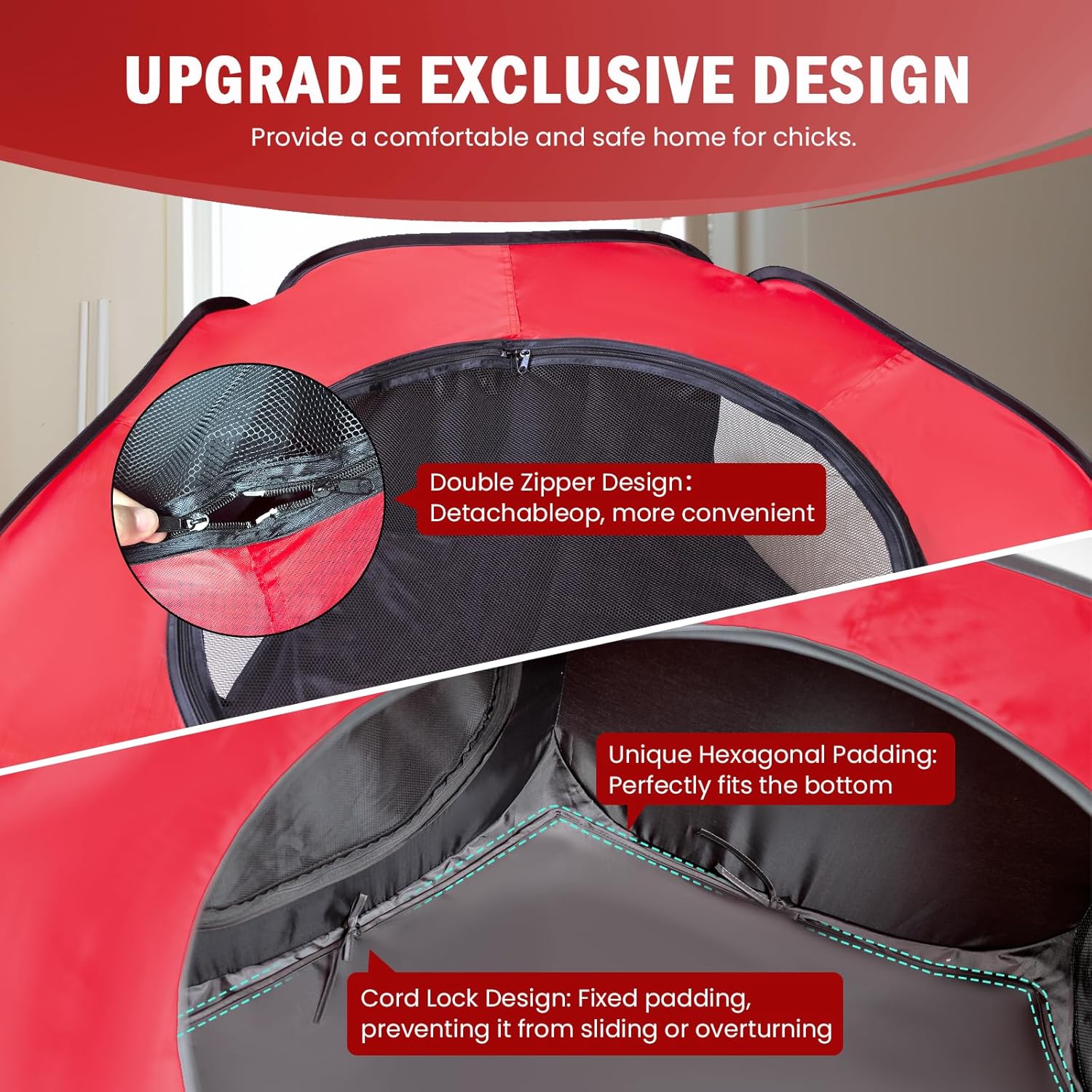 - EASY TO PUT UP & FOLD - Featuring a pop-up design and built-in frame, the chicken brooder box is easy to open and close. It includes 3 ground pegs for outdoor use and folds into a plate-sized storage bag.